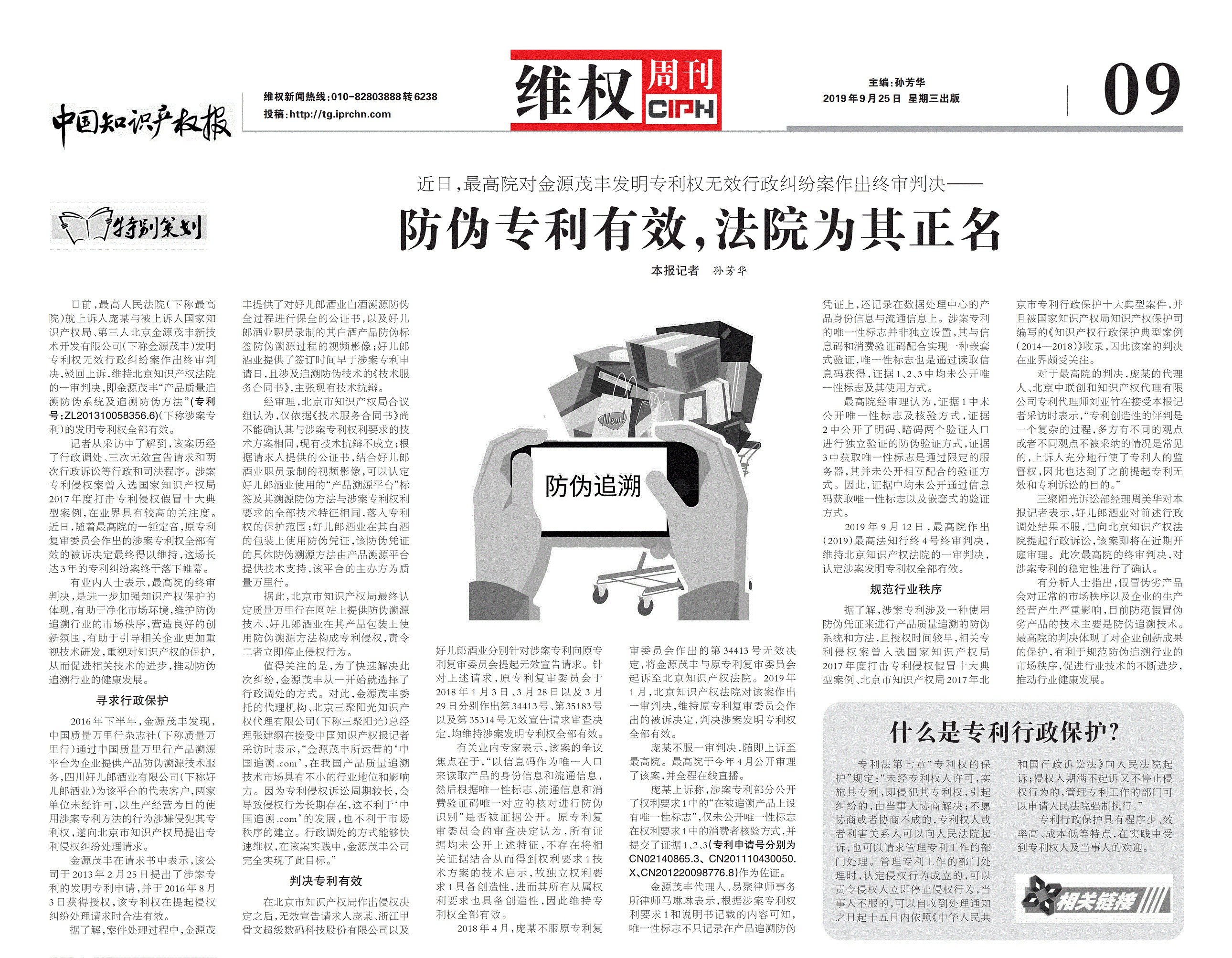 三聚陽光訴訟部經(jīng)理周美華接受知識產(chǎn)權(quán)報記者采訪時表示,好兒郎酒業(yè)對前述行政調(diào)處結(jié)果不服,已向北京知識產(chǎn)權(quán)法院提起行政訴訟,該案即將在近期開庭審理。此次最高院的終審判決,對涉案專利的穩(wěn)定性進行了確認。假冒偽劣產(chǎn)品會對正常的市場秩序以及企業(yè)的生產(chǎn)經(jīng)營產(chǎn)生嚴重影響,目前防范假冒偽劣產(chǎn)品的技術(shù)主要是防偽追溯技術(shù)。最高法的判決體現(xiàn)了對企業(yè)創(chuàng)新成果的保護,有利于規(guī)范防偽追溯行業(yè)的市場秩序,促進行業(yè)技術(shù)的不斷進步,推動行業(yè)健康發(fā)展。
