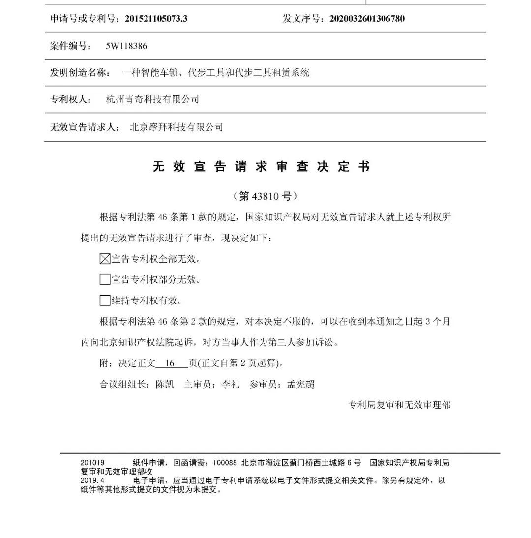 3月31日,由三聚陽光代理的北京摩拜科技有限公司與杭州青奇科技有限公司(青桔單車)的一場(chǎng)專利無效宣告案勝利結(jié)案。在國家知識(shí)產(chǎn)權(quán)局作出的第43810號(hào)無效審查決定中,專利權(quán)人青奇科技擁有的專利號(hào)為201521105073.3 的”一種智能車鎖、代步工具和代步工具租賃系統(tǒng)“專利,專利權(quán)被宣告全部無效。此案中,三聚陽光代理方為請(qǐng)求人摩拜公司。