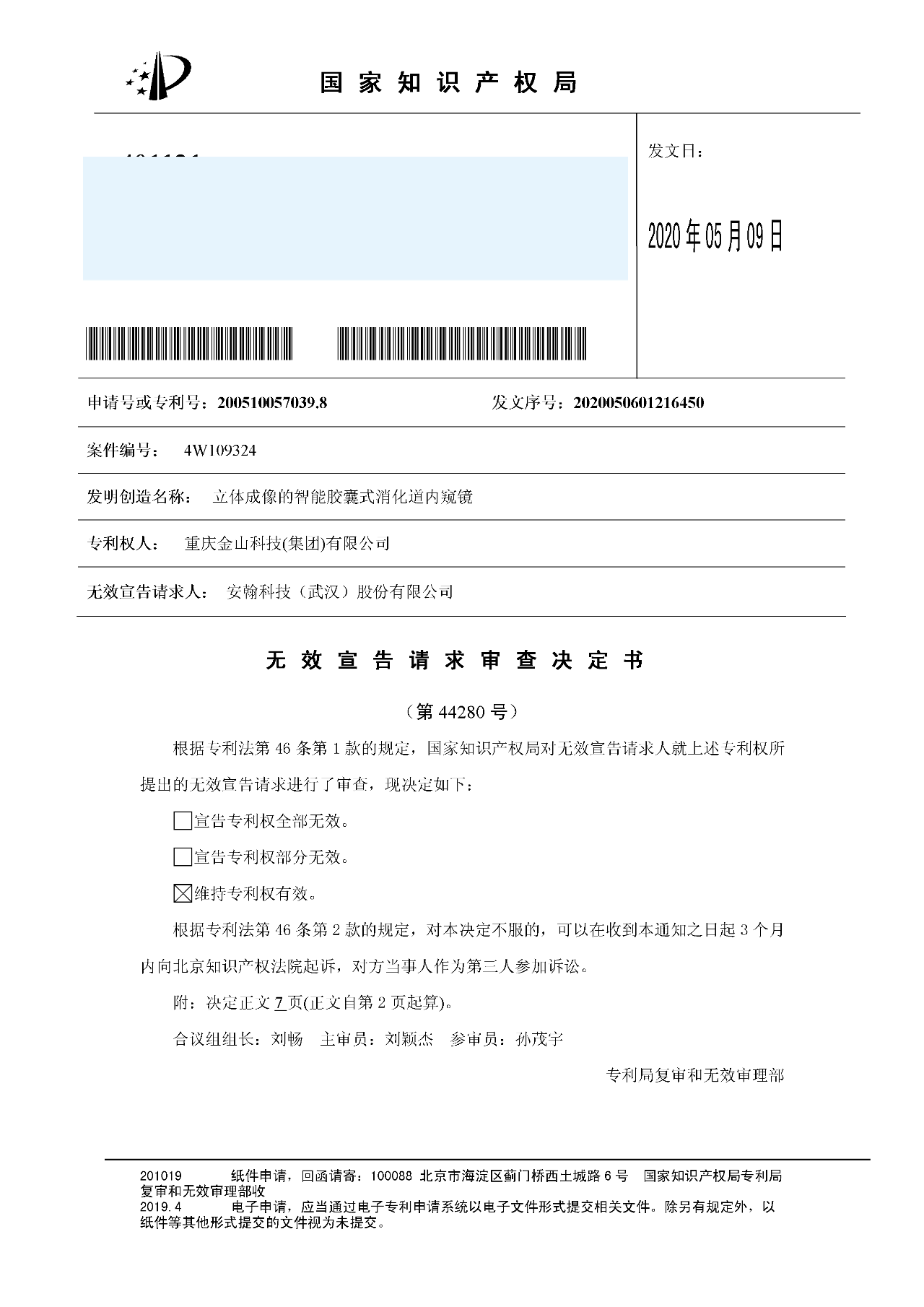 近日,三聚陽(yáng)光及旗下易聚律所代理的專利權(quán)人重慶金山與安翰科技的一起發(fā)明專利無(wú)效宣告案勝利結(jié)案。國(guó)家知識(shí)產(chǎn)權(quán)局作出第 44280 號(hào)審查決定,維持重慶金山專利號(hào)為“200510057039.8”、名稱為“立體成像的智能膠囊式消化道內(nèi)窺鏡”的發(fā)明專利專利權(quán)全部有效。