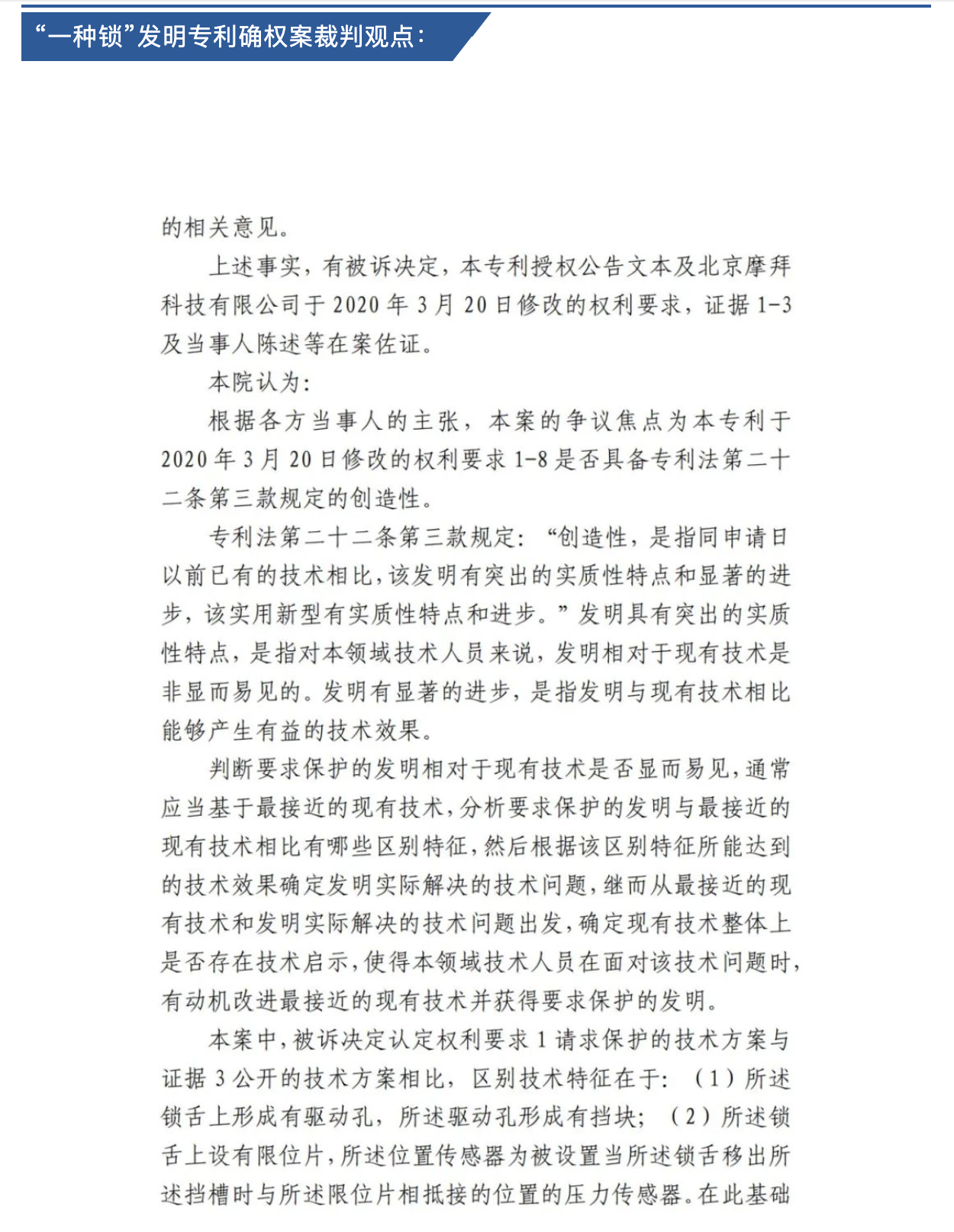 該案涉案專利“一種鎖”專利號為201510886031.6,專利權(quán)人是北京摩拜科技有限公司,北京小桔科技有限公司(即滴滴出行)曾作為無效請求人申請宣告該專利無效。在專利被維持有效后,北京小桔科技有限公司的起訴被北京知識產(chǎn)權(quán)法院駁回。