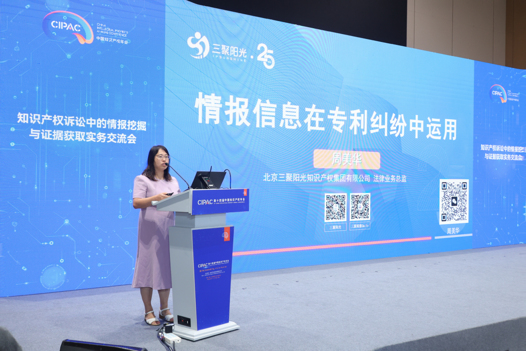在本次交流會(huì)的核心分享環(huán)節(jié),三聚陽(yáng)光知識(shí)產(chǎn)權(quán)集團(tuán)法律業(yè)務(wù)總監(jiān)周美華律師發(fā)表了題為《情報(bào)信息在專利糾紛中運(yùn)用》的精彩演講,聚焦專利訴訟中的取證策略制定,深入剖析了情報(bào)分析在知識(shí)產(chǎn)權(quán)維權(quán)實(shí)踐中的關(guān)鍵價(jià)值。