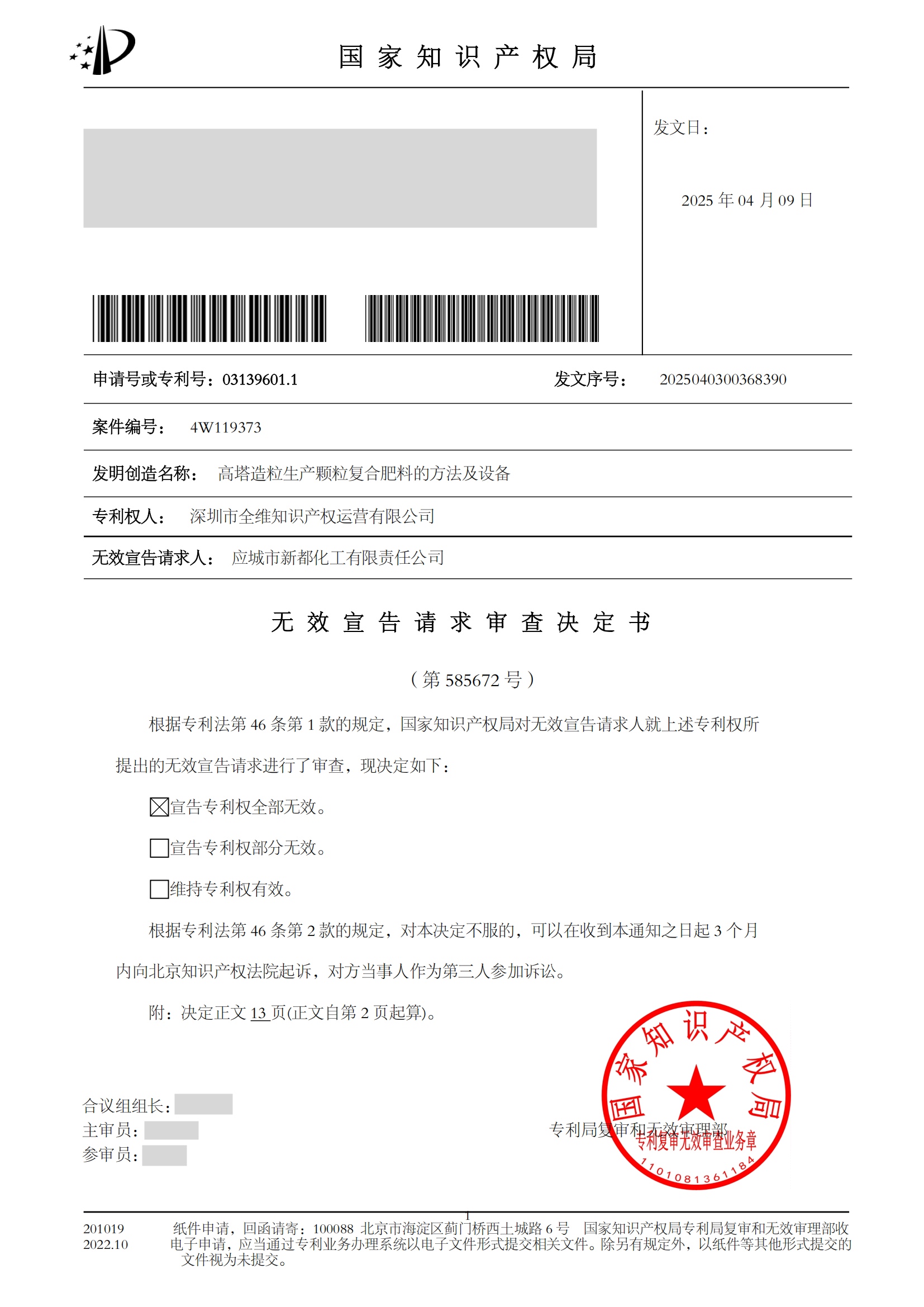 據(jù)此,國家知識產(chǎn)權(quán)局于2025年4月9日正式發(fā)出第585672號無效宣告請求審查決定書,宣告專利號為 03139601.1 的“高塔造粒生產(chǎn)顆粒復合肥料的方法及設(shè)備”發(fā)明專利權(quán)全部無效。