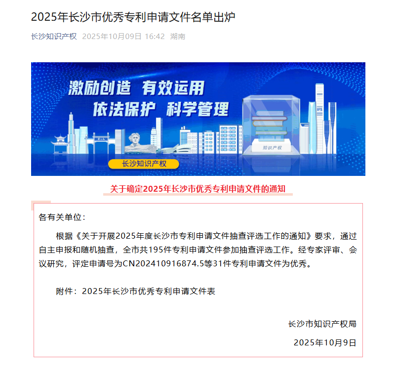 10月9日,長沙市知識產(chǎn)權(quán)局公布“2025年度長沙市優(yōu)秀專利申請文件名單”,北京三聚陽光知識產(chǎn)權(quán)代理有限公司撰寫的2件發(fā)明專利申請文件成功入選,彰顯了公司在高質(zhì)量專利撰寫領(lǐng)域的出色實(shí)力和穩(wěn)定發(fā)揮。