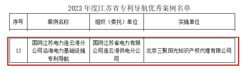 近日,三聚陽光集團(tuán)研究咨詢團(tuán)隊(duì)承擔(dān)的《沿海電力基礎(chǔ)設(shè)施專利導(dǎo)航》項(xiàng)目成果獲江蘇省知識產(chǎn)權(quán)局高度認(rèn)可,正式入選首批“江蘇省專利導(dǎo)航優(yōu)秀案例名單”,并于2024年全國知識產(chǎn)權(quán)宣傳周活動(dòng)江蘇分會場活動(dòng)現(xiàn)場發(fā)布。