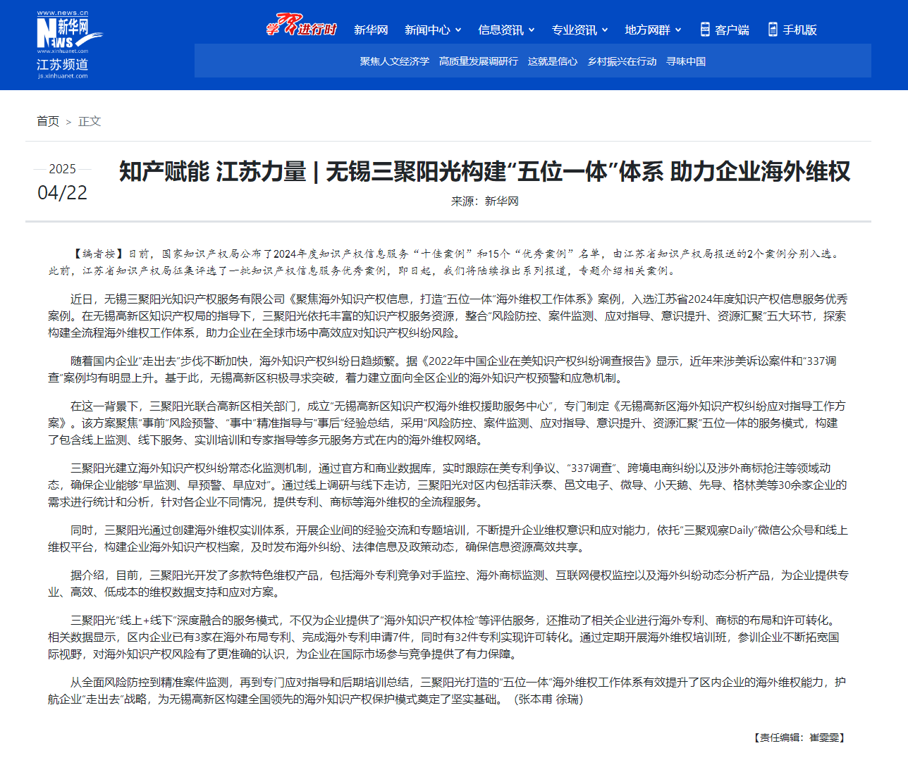 知產(chǎn)賦能 江蘇力量 | 無錫三聚陽光構(gòu)建“五位一體”體系 助力企業(yè)海外維權(quán)
