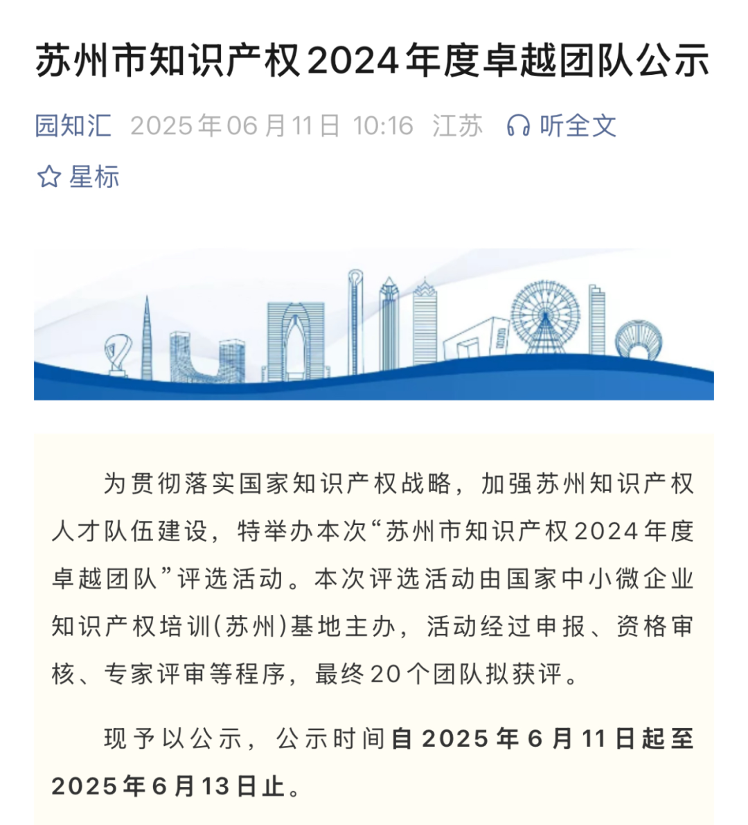 近日,“蘇州市2024年度知識產權卓越團隊”榜單公布,三聚陽光集團蘇州公司服務團隊憑借出色的專業(yè)能力和對區(qū)域創(chuàng)新發(fā)展的貢獻成功入選。